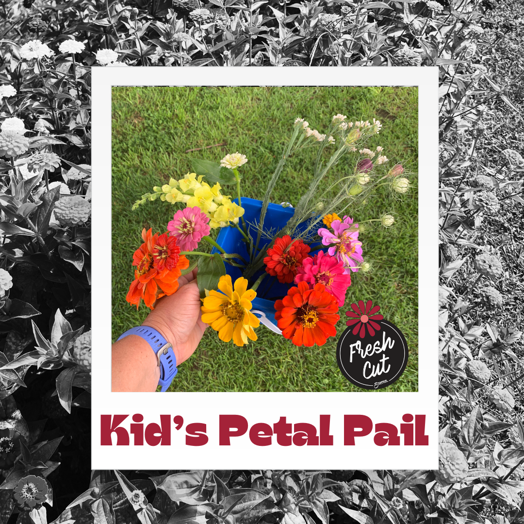 Purchase Flowers & Events › Kid's Petal Pail Image 1 of 3 Image 2 of 3 Image 3 of 3 Kid's Petal Pail $6.00 Kid’s Petal Pail IncludesBucket, Pail, or Plastic Vase10 U-Cut Flower Stems from designated kid’s rows Add To Cart Added! Kid’s Petal Pail IncludesBucket, Pail, or Plastic Vase10 U-Cut Flower Stems from designated kid’s rows